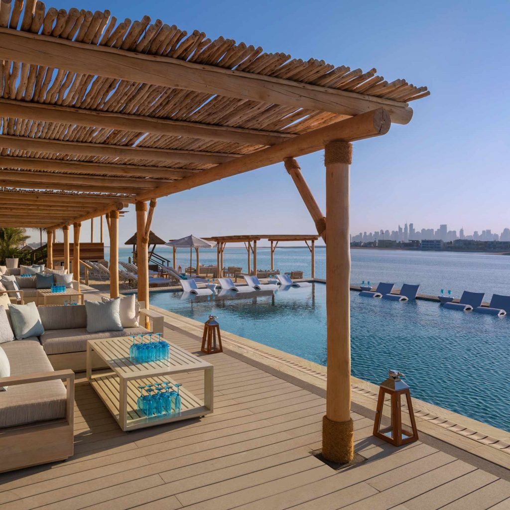 La particularité de cet endroit, c’est son « Lagon », une infinity pool donnant sur Dubai Creek avec du sable à l’intérieur. Le beach club est superbe et le restaurant (qui a été créé par l’équipe du restaurant La Cantine) est aussi excellent. Si vous recherchez un endroit plutôt calme à faire en couple, je vous recommande cet endroit.